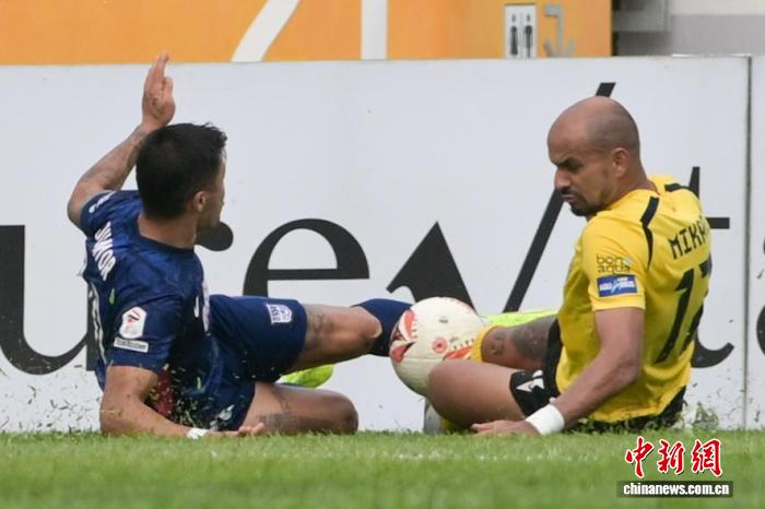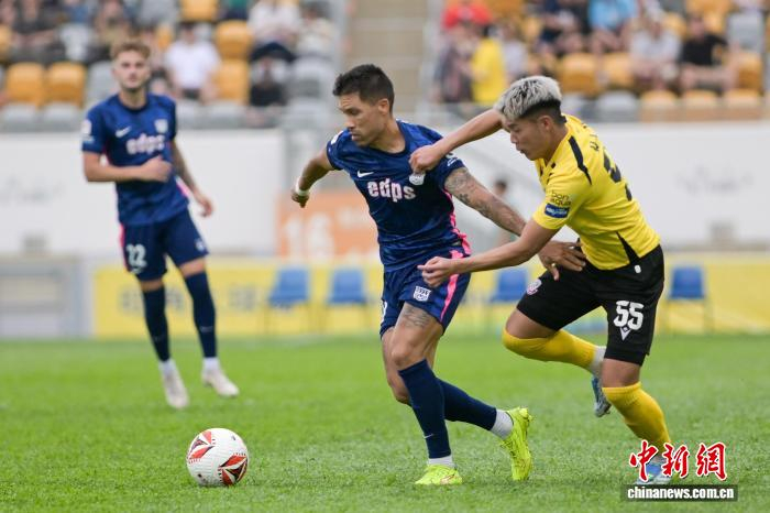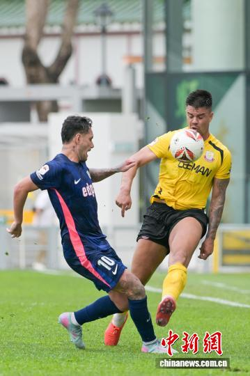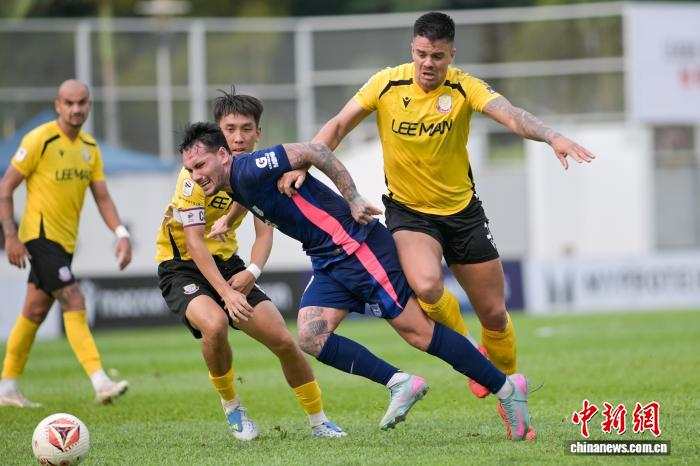 4月7日,2025-26年度中国香港足球总会联赛杯决赛在香港旺角大球场上演,理文队以2:1击败杰志队,夺得冠军。理文队成立于2017年,是香港足坛劲旅。图为理文队球员胡晋铭(黄衣)与杰志队球员利安度拼抢。中新网记者 陈永诺 摄
