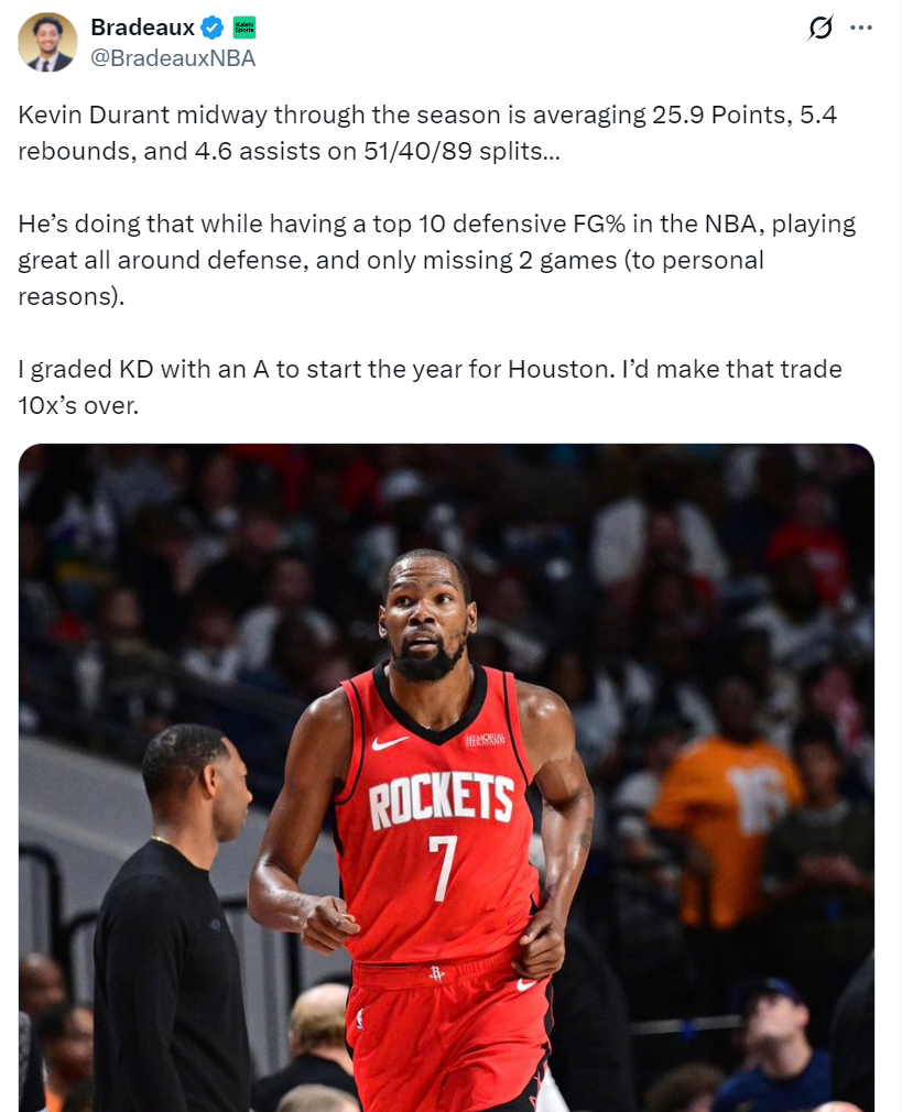 对阵费城的赛前火箭记者写道:杜兰特本赛季场均得到 25.9 分、5.4 个篮板和 4.6 次助攻,投篮命中率 51%,三分球命中率 40%,罚球命中率 89%,他限制对手命中率联盟前十,防守端非常全面,而且只因为个人原因缺席两场比赛,我给杜兰特交易到休斯顿打了A的评级,如果有这样的机会我会做10次这样的交易。